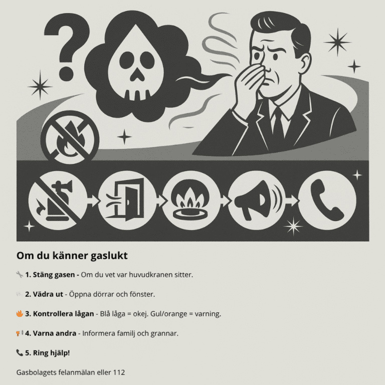 Är du osäker eller misstänker läcka – kontakta alltid en auktoriserad gasinstallatör direkt.